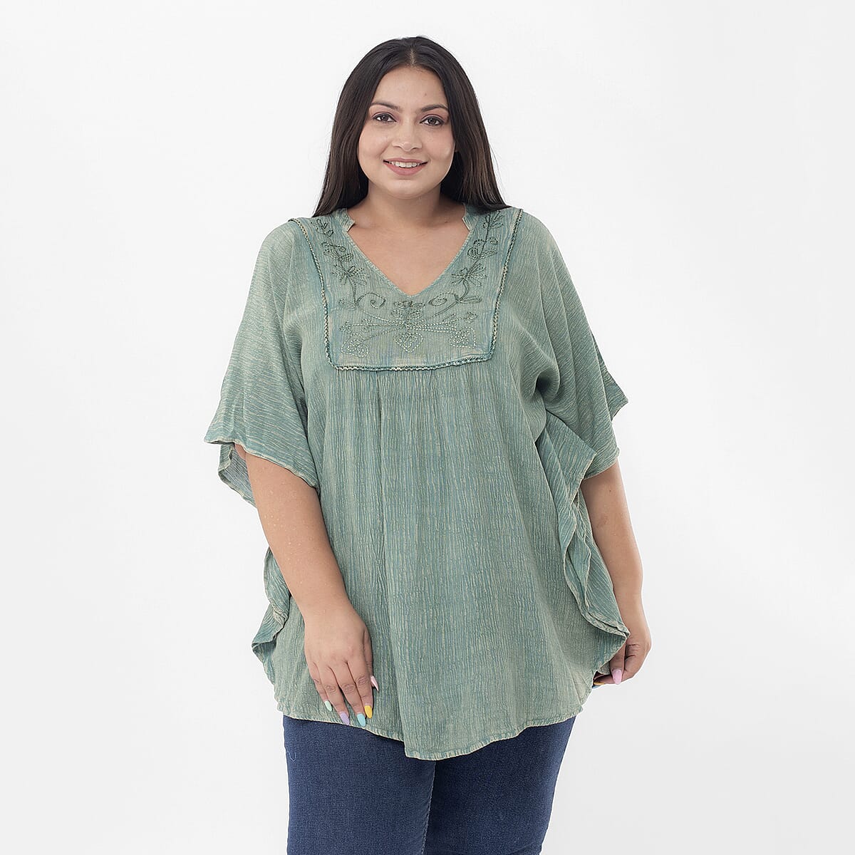 Tamsy Mint Green Embroidered V-Neck Stone Wash Kaftan - One Size Fits Most