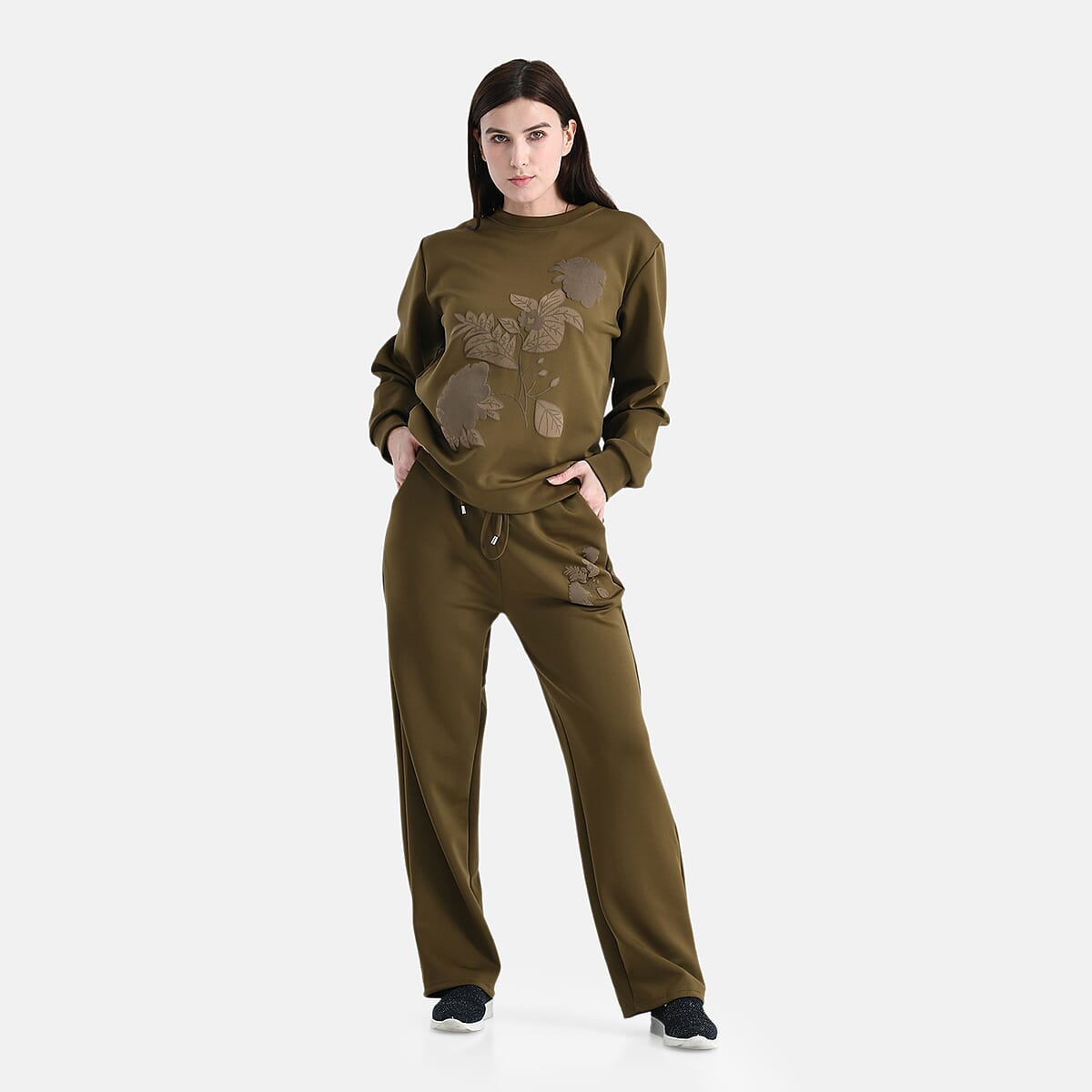 TAMSY Olive Floral Embossed Scuba Knit Pant and Long Sleeve Pullover Set – S/M