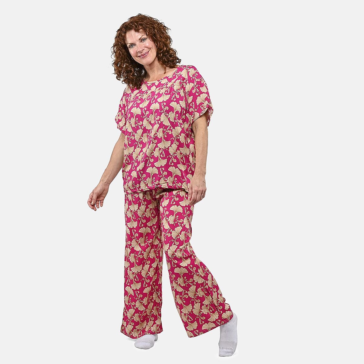 Tamsy Pink Ginkgo 2 Piece Lounge Set with Wide Leg Pants - One Size Fits Most