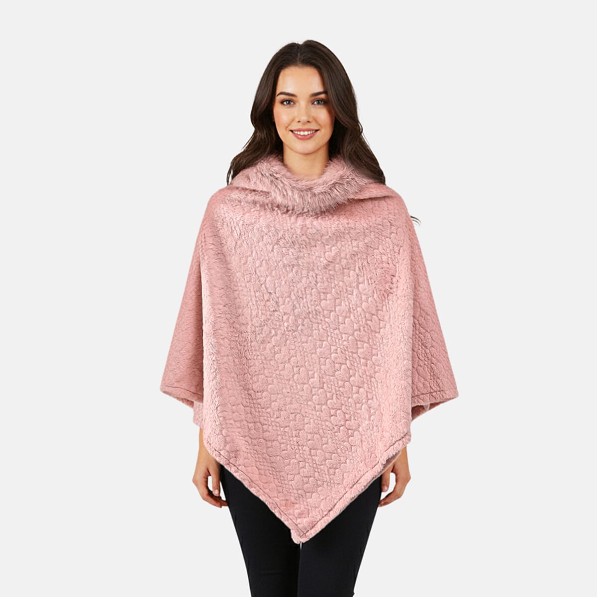 TAMSY Pink Jacquard Poncho with Fur Collar – One Size Fits Most