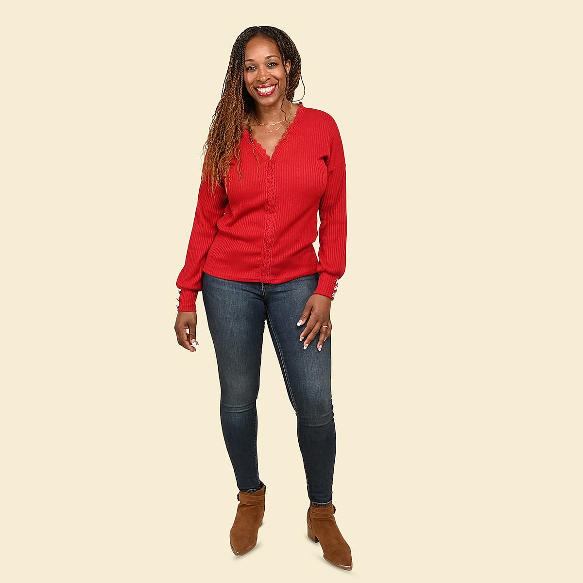 Stay warm and comfortable all day with this beautifully designed knit sweater from TAMSY. This sweater is made with high-quality material to make it soft and skin-friendly. The lace detailing and decorative buttons enhance its look. It comes with a V-neck design and full sleeves to make it easier to wear. Wear it daily when heading outdoor, traveling, shopping, or more.