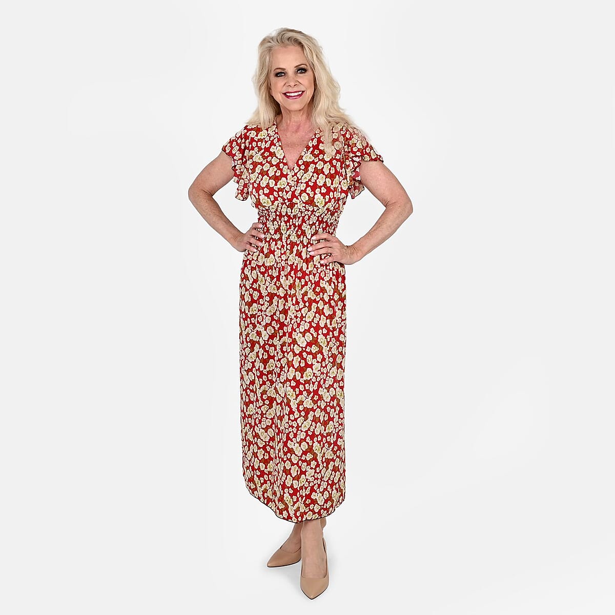 Tamsy Red Floral Smocked Waist Maxi Dress with Flutter Sleeve (One Size fits up to XL)