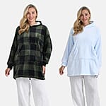 Tamsy Set of 2 Light Blue Solid and Green Plaid Pattern, Fleece Hoodie Sweater Blanket with Kangaroo Pocket