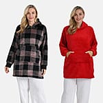 Tamsy Set of 2 Red Solid and Tan Plaid Pattern, Fleece Hoodie Sweater Blanket with Kangaroo Pocket
