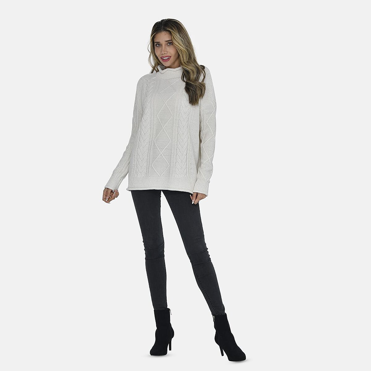 Tamsy White Traditional Roll Neck Fisherman Sweater - M