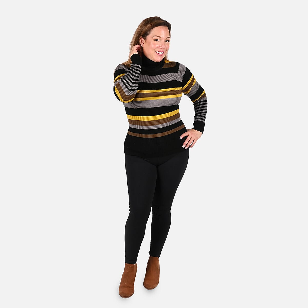 Tamsy Yellow and Black Striped Rib Knit Turtleneck Sweater - L