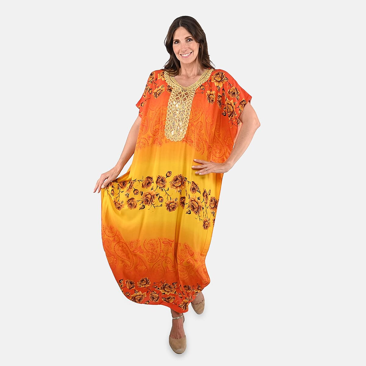 Tamsy Yellow Rose Pattern Kaftan With Neckline Embroidery - One Size Fits Most