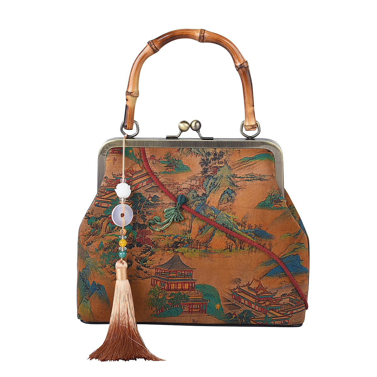 Tan Asian Ancient Architecture Pattern Gambiered Canton Gauze with Genuine Leather Tote Bag with Bamboo Handle Drop