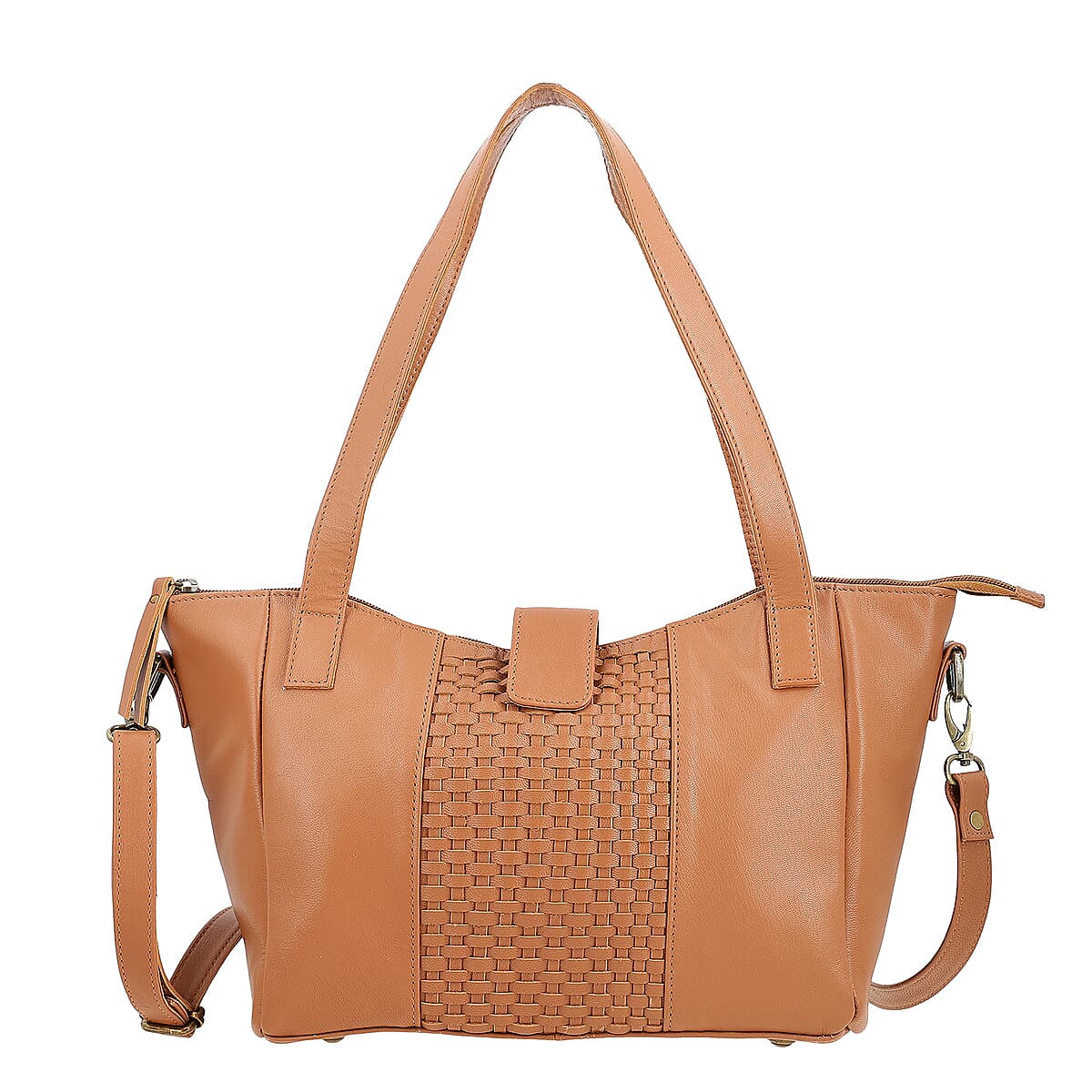 Tan Genuine Leather Weave Pattern Shoulder Bag