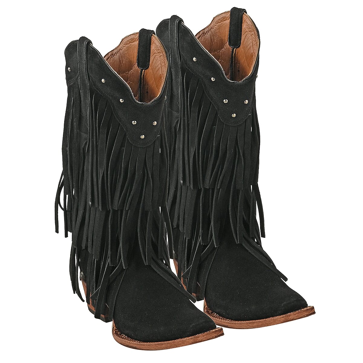 TANNER MARK 100% Genuine Suede Leather Western Style Square Toe Boot with Fringe - Black - Size 7.5