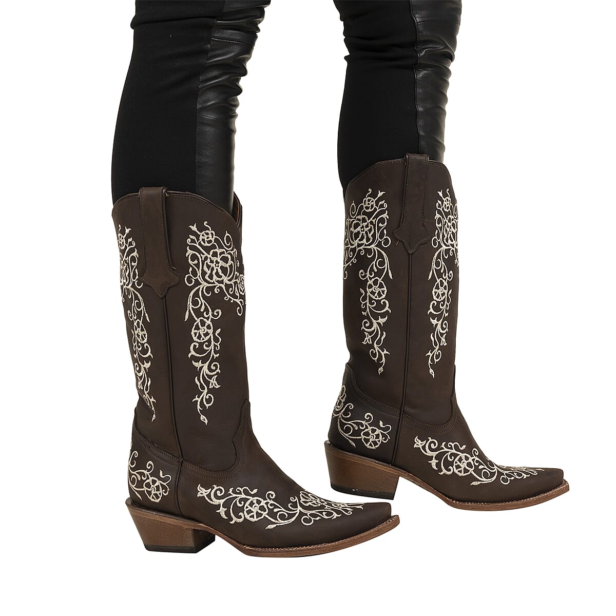Tanner Mark Dark Brown Floral Stitched Snip Toe Boot 9 | Leather Boots | Biker Boots | Snip Toe Cowboy Boots | Heel Boots