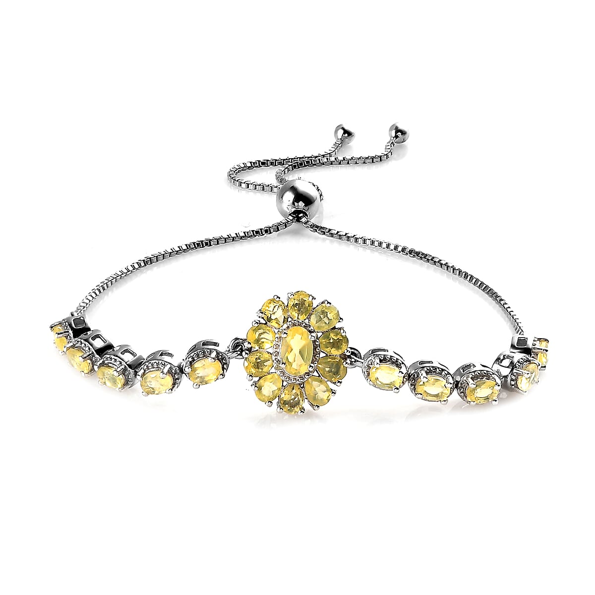 This opal bolo bracelet in sterling silver captures the beauty of the floral theme. This theme symbolizes the fleeting beauty of nature. Finely shaped canary opals are set like the petals in the center, and oval-shaped gems form the symmetrical row. Crafted in sterling silver with a platinum finish, this bracelet exhibits a clean and simple look.