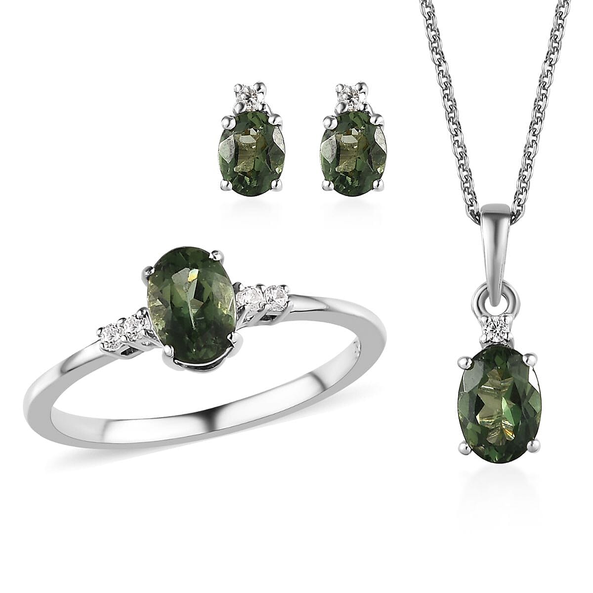 Tanzanian Natural Green Apatite and White Zircon Stud Earrings, Ring (Size 7.0) and Pendant in Platinum Over Sterling Silver 2.35 ctw