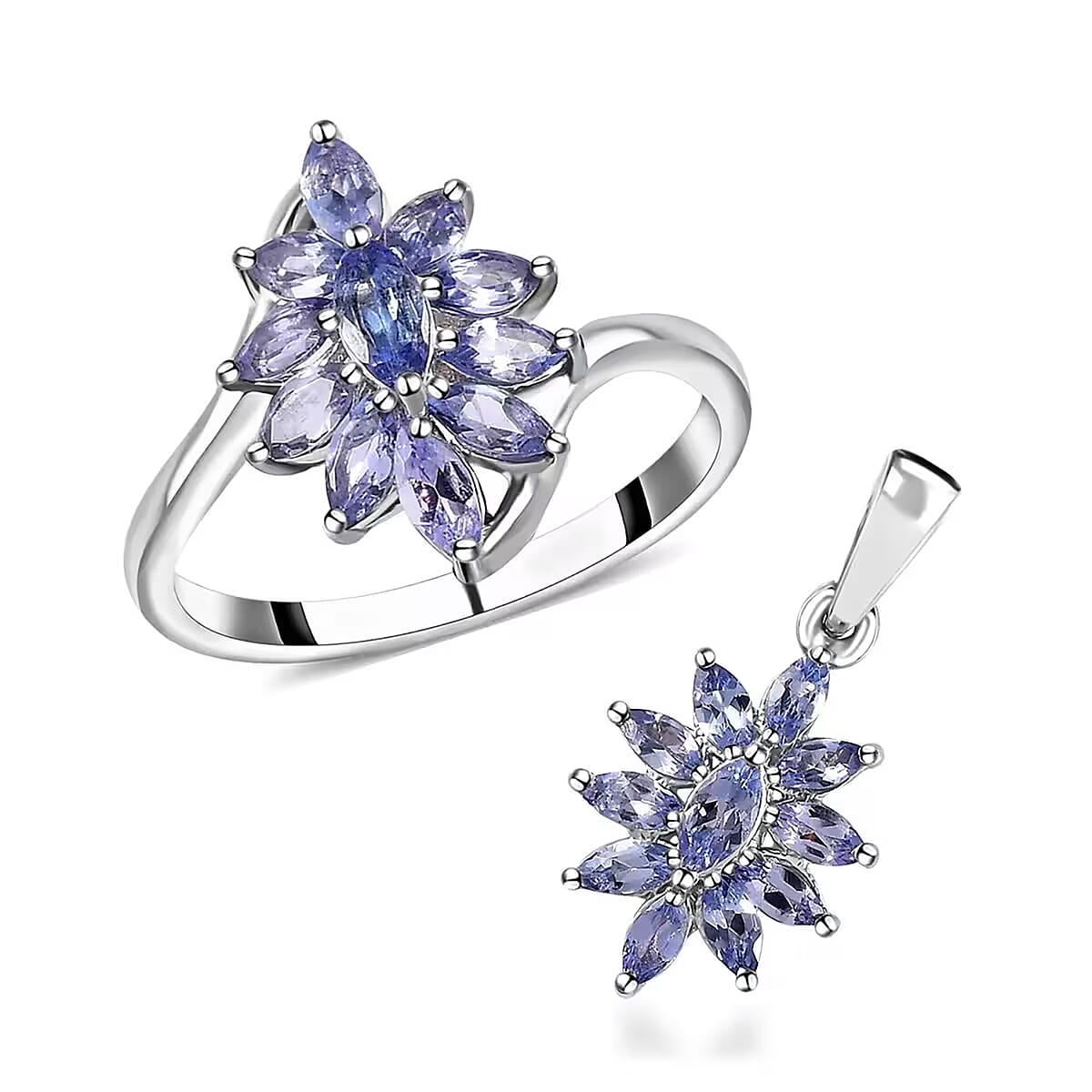Tanzanite 2.10 ctw Flower Jewelry Set in Platinum Plated Sterling Silver, Tanzanite Flower Ring, Tanzanite Flower Pendant without Chain, Engagement Gifts For Women (Size 9.0)
