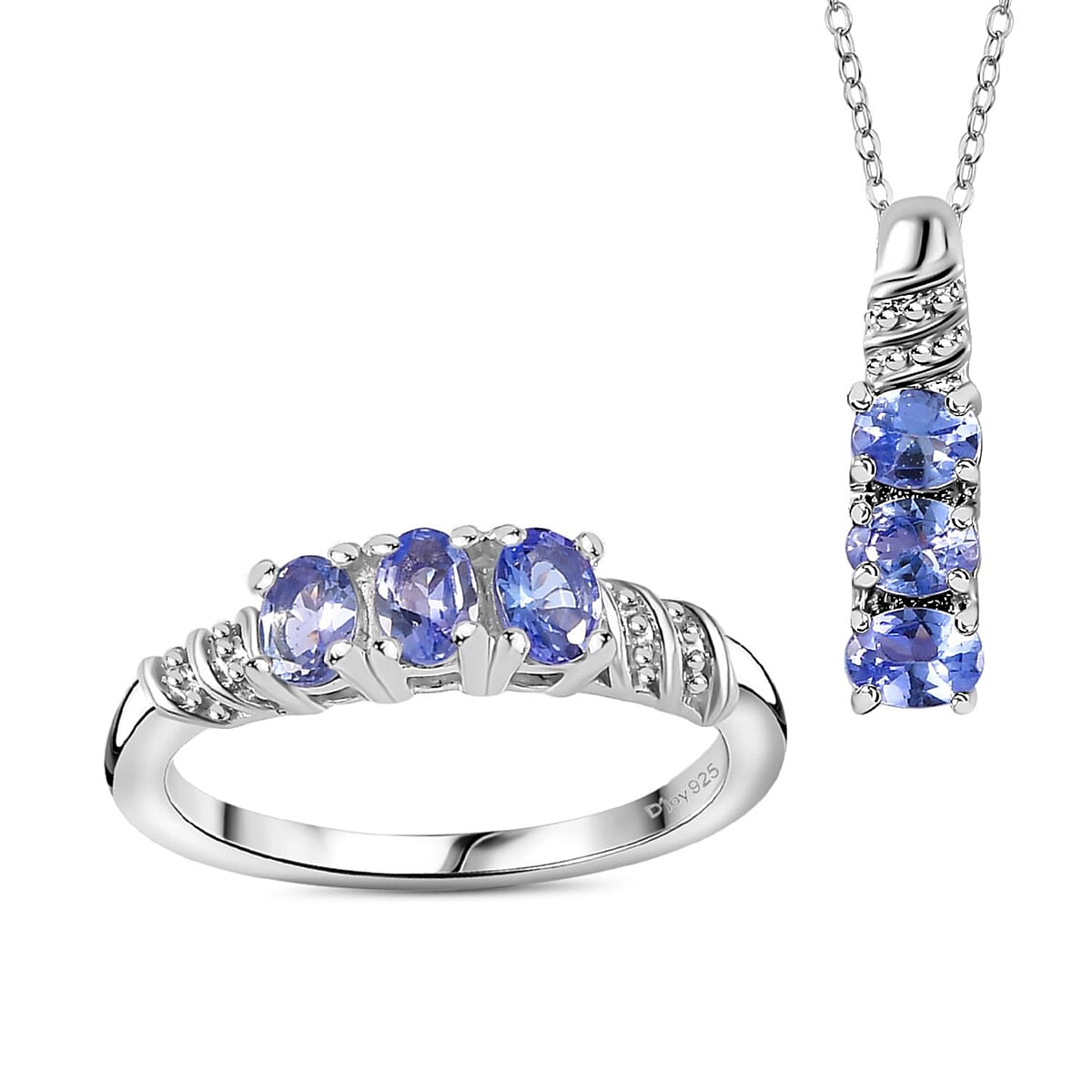 Tanzanite 3 Stone Ring (Size 8.0) and Pendant Necklace 20 Inches in Platinum Over Sterling Silver 1.00 ctw