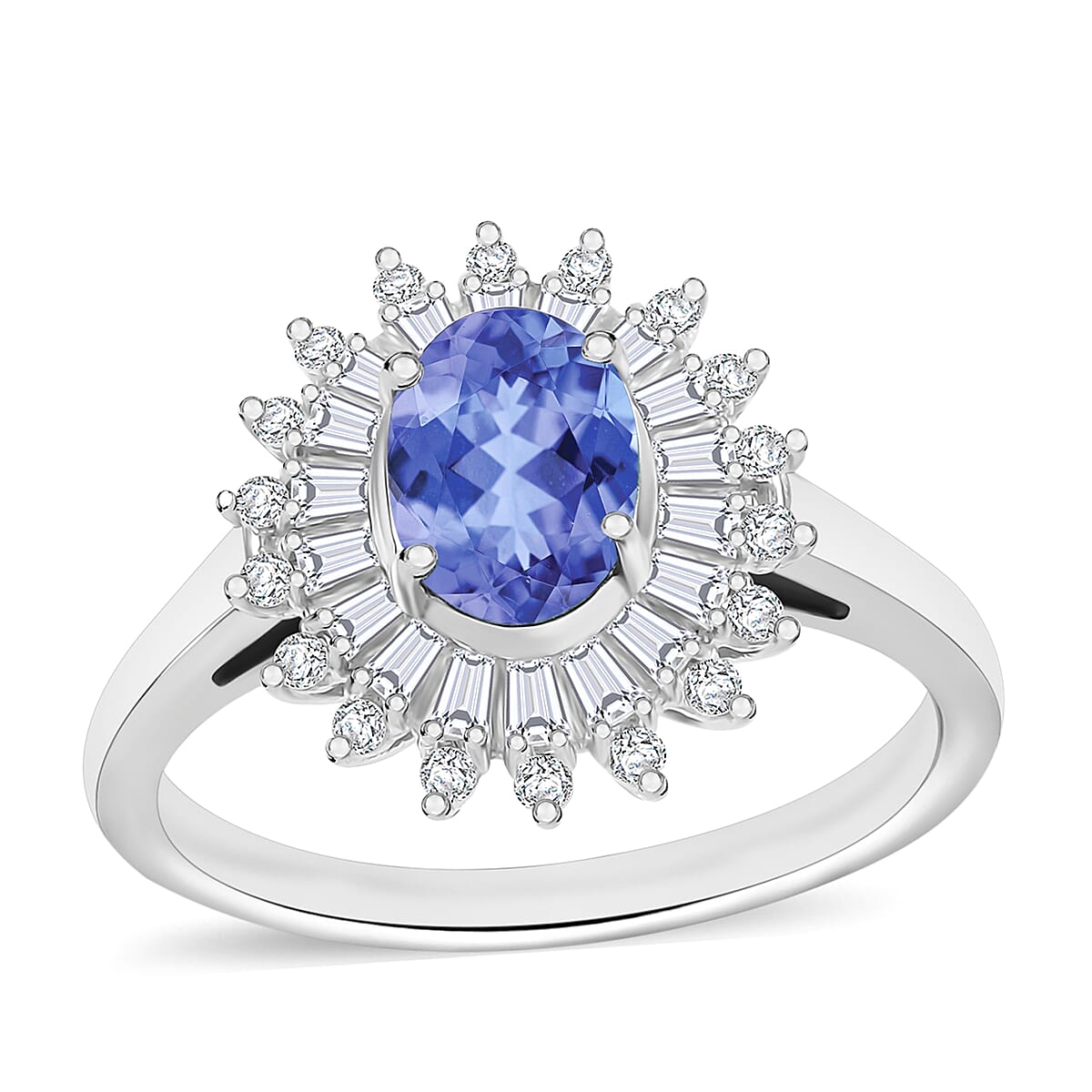 Tanzanite and Moissanite 2.48 ctw Sunburst Ring in Rhodium Over Sterling Silver (Size 12.0) (Del. in 10-12 Days)