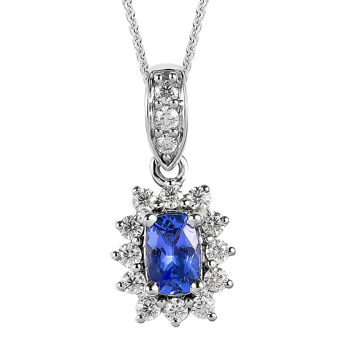 Tanzanite and Moissanite Sunburst Pendant Necklace 20 Inches in Platinum Over Sterling Silver 0.90 ctw