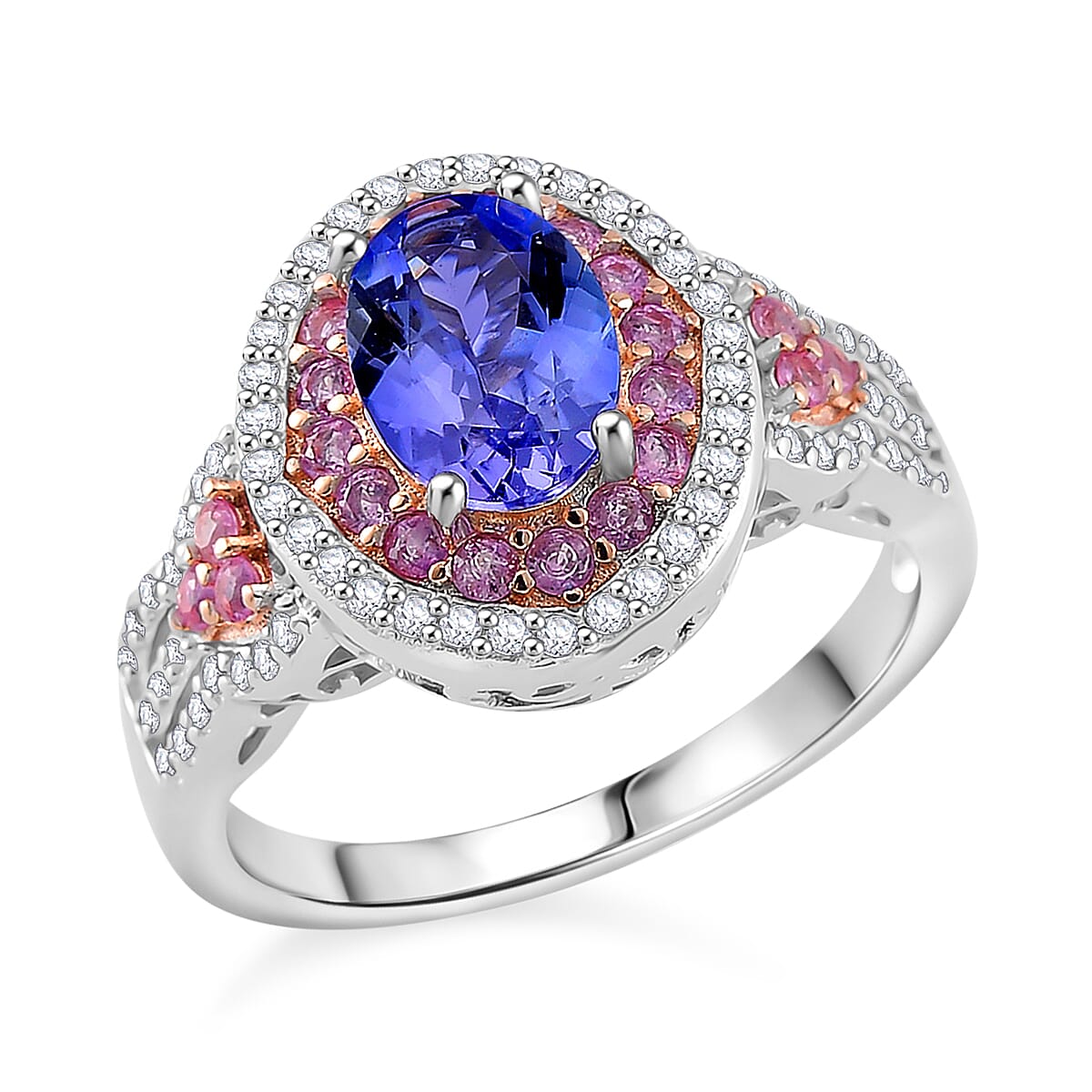Showcase your distinctive style with this tanzanite double halo ring, highlighted by zircons and pink sapphires. Crafted in sterling silver, this tanzanite ring for women encircles your finger with elegance. It's an ideal gift that symbolizes a tribute to achievements and personal milestones.