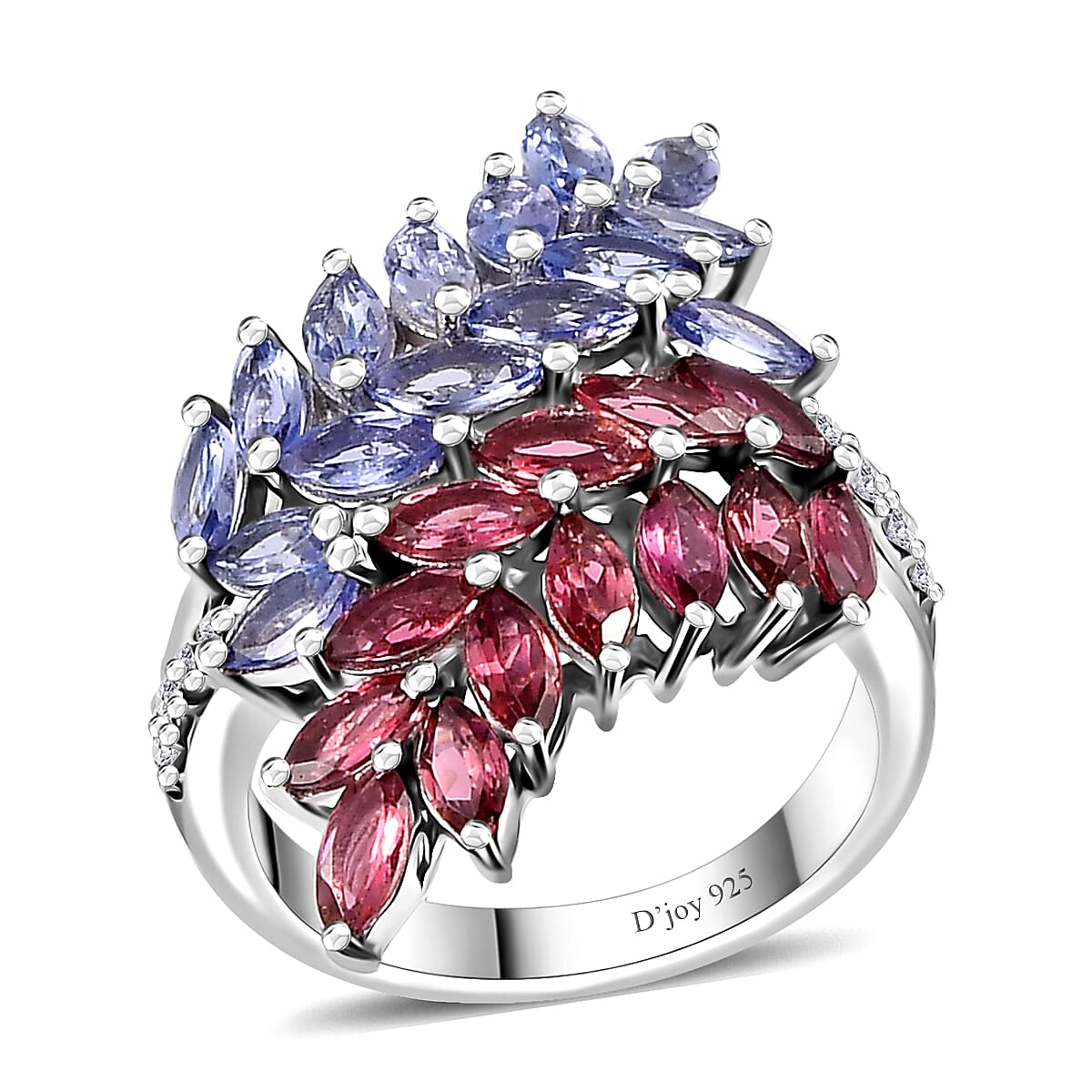 Uplift your ensemble with this tanzanite and multi gemstone ring in rhodium over sterling silver. Featuring marquise shape tanzanite and red gemstones studded leafy vines, and adorned with a sparkling white gemstone on the shank, this ring exudes nature's elegance.