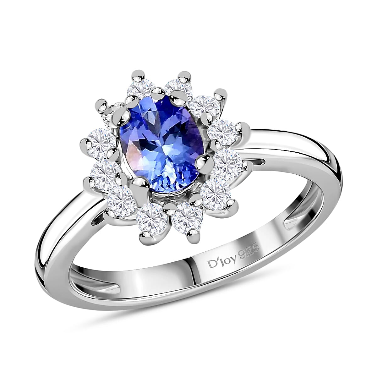 Tanzanite and Natural White Zircon Halo Ring in Platinum Over Sterling Silver, Oval Engagement Ring (Size 8.0) 1.00 ctw
