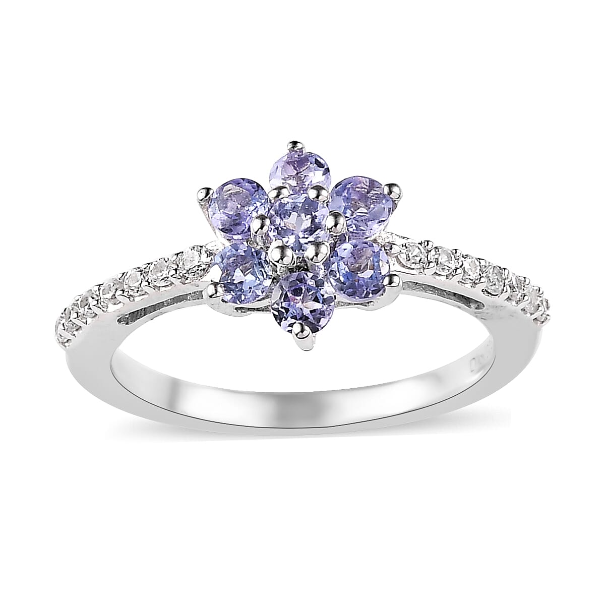 Tanzanite and White Zircon Floral Ring in Platinum Over Sterling Silver (Size 7.0) 0.70 ctw
