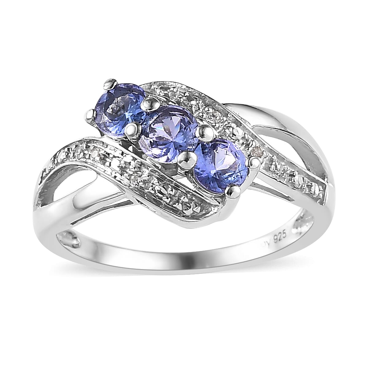 The tanzanite trilogy ring embodies a poetic blend of past, present, and future. Three radiant rounds of tanzanite, set in a diagonal dance, are framed by the sparkle of white zircons. Encased in platinum over sterling silver, it's a timeless tribute to moments that matter.