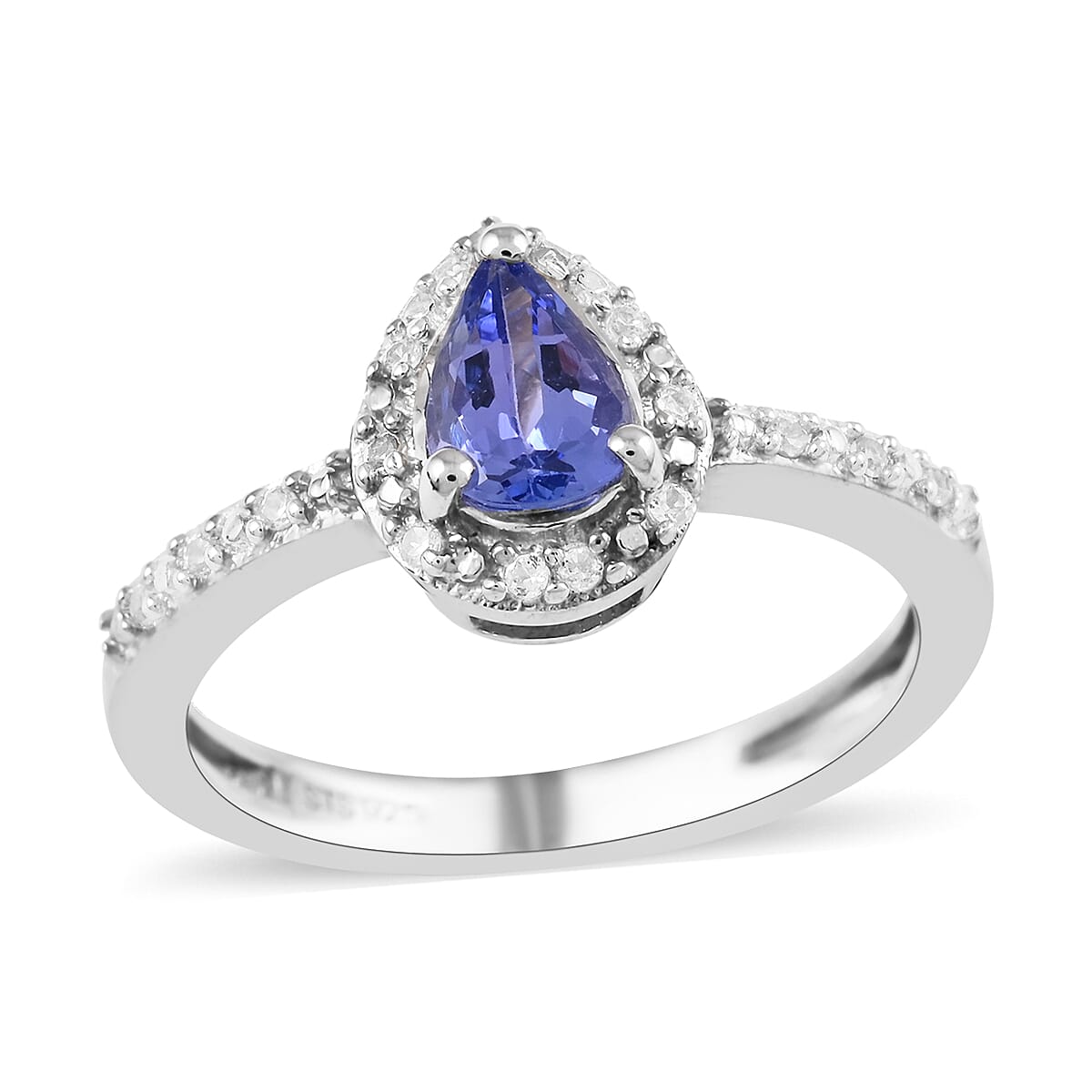 This tanzanite ring is inspired by a halo design. This ring features a pear-shaped tanzanite in the center. This stunning ring features a beautiful pear-shaped tanzanite gemstone. A halo of shimmering white zircons surrounds this gem. Tanzanite is known for its unique blue-violet hue and is one of the rarest gemstones in the world. The pear shape halo design adds a touch of elegance and sophistication. This tanzanite halo ring is crafted in sterling silver.