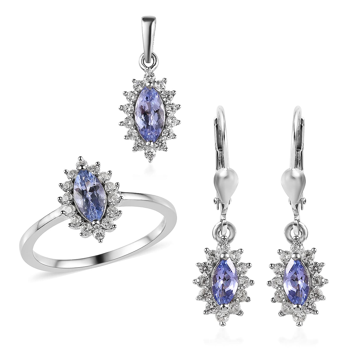 Tanzanite Jewelry Set | Sunburst Jewelry Set | White Zircon Accent Jewelry Set | Sunburst Earrings, Sunburst Ring and Sunburst Pendant |Platinum Over Sterling Silver Jewelry Set 2.60 ctw