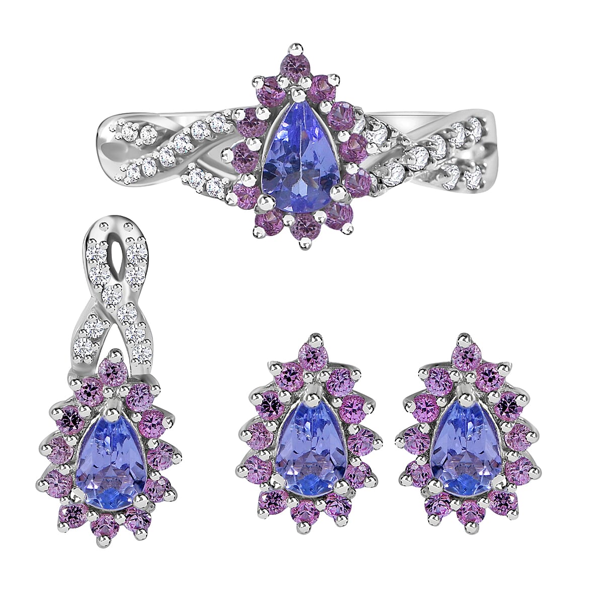 Tanzanite, Madagascar Pink Sapphire and White Zircon Floral Stud Earrings, Ring (Size 6) and Pendant in Platinum Over Sterling Silver 2.85 ctw