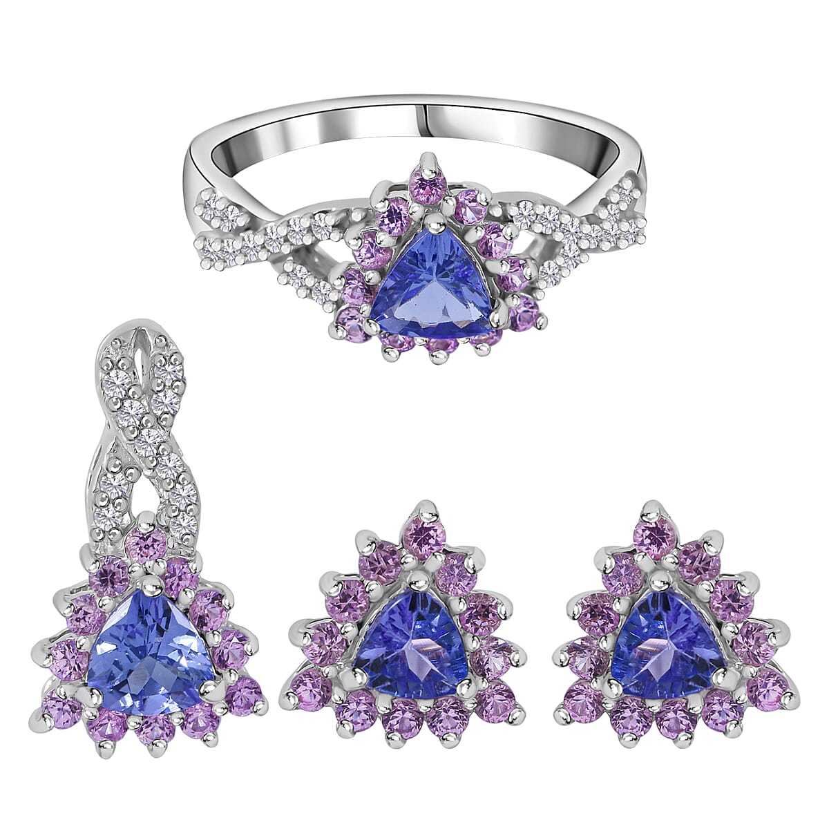 Tanzanite, Madagascar Pink Sapphire and White Zircon Floral Stud Earrings, Ring (Size 6) and Pendant in Platinum Over Sterling Silver 2.90 ctw