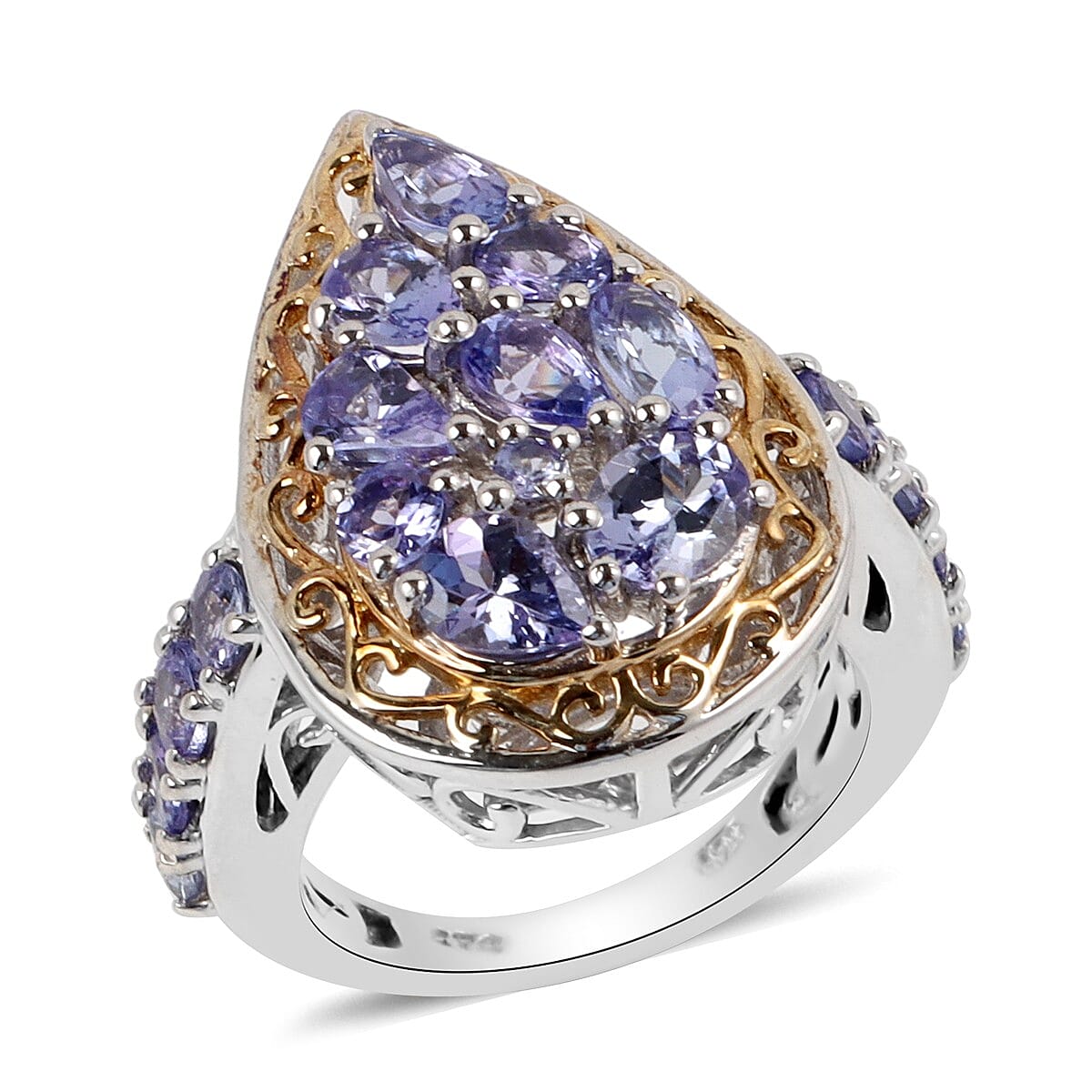 Leave everyone spellbound with divine blue hued tanzanite cluster ring. Blue being one of the most popular colors globally, makes this the most loved ring. Pear-shaped frame is adorned with tanzanites set closely to form a cluster and adds uniqueness to this ring. The cluster is surrounded with yellow gold scrollwork border. The designer shank adoring this cluster ring features tanzanite array embellishment. The mysterious blues and enchanting violets of tanzanite create a mystique that quickly intrigues us all. This ring is beautifully framed in 14K yellow gold and platinum-plated sterling silver to enhance its beauty. The metal is durable and hypoallergenic.