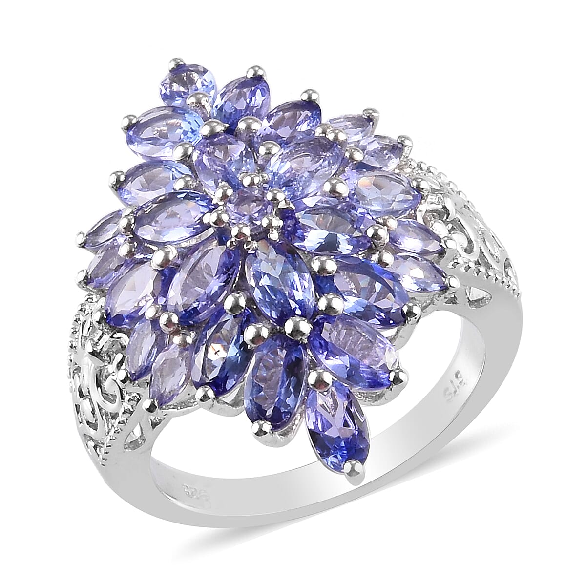 Contemporary art binds the foundation of this tanzanite ring. Round, marquise, and oval tanzanite are studded in a floral pattern with a secure setting. This fashionable ring is designed in sterling silver to sustain the luster for long term. Tanzanite exhibit pleochroic properties, radiating violet-blue hues with flashes of red. Floral pattern with integrated contemporary art symbolizes the fleeting beauty of nature.