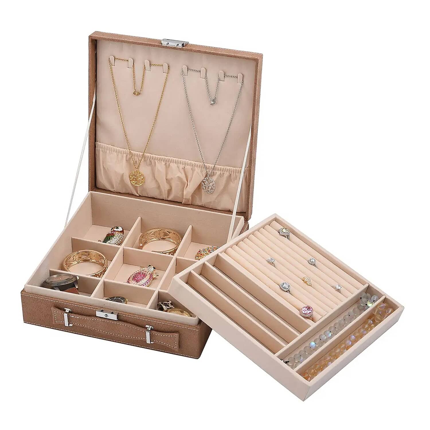 Taupe Faux Velvet Briefcase Style 2-tier Jewelry Box, Scratch resistant and Anti-Tarnish Jewelry Storage Box, Anti Tarnish Jewelry Case, Jewelry Organizer (Approx 60 Rings, etc.)