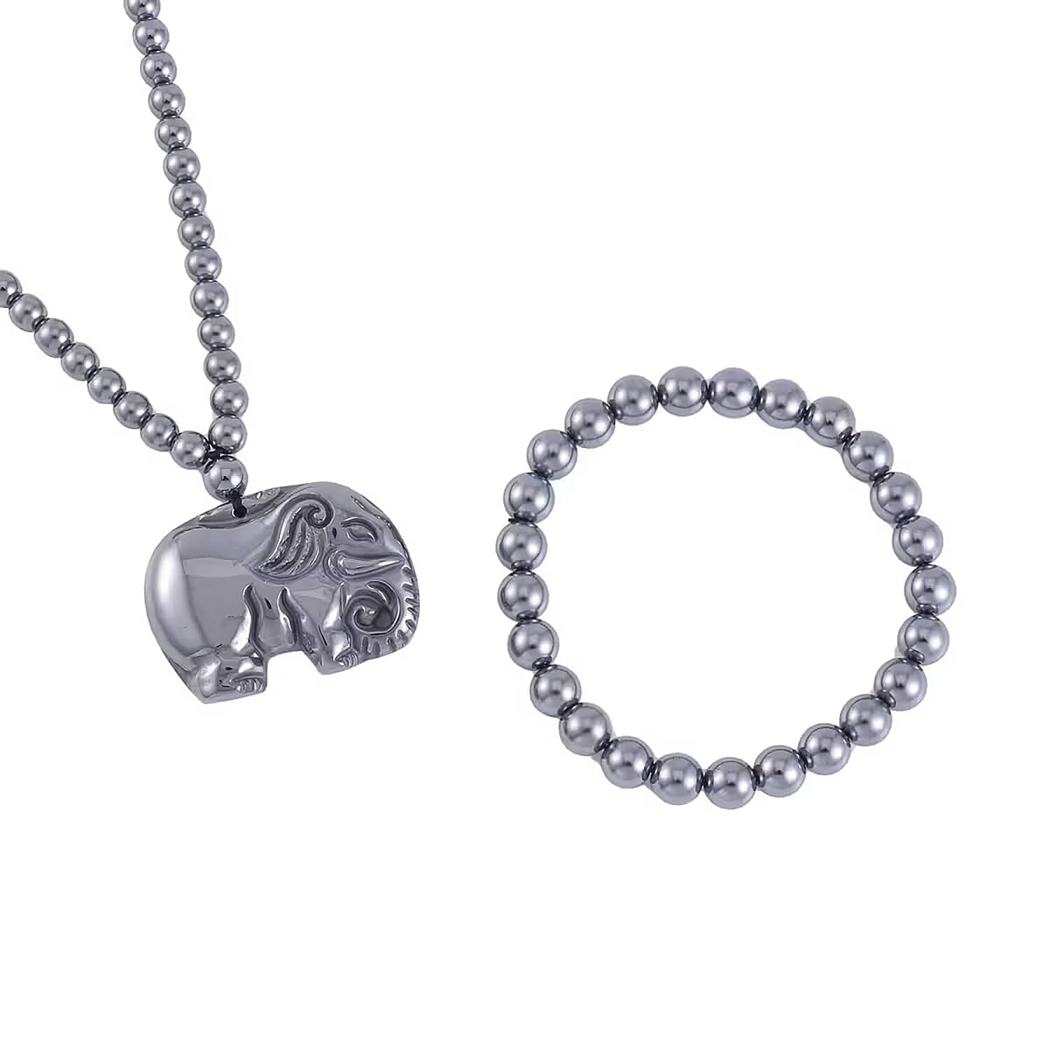 Enhance your style with this stunning terahertz jewelry set, featuring a timeless pendant necklace and a beaded stretch bracelet. The meticulously carved pendant and elegant beads create a harmonious blend of fashion and healing stone jewelry.