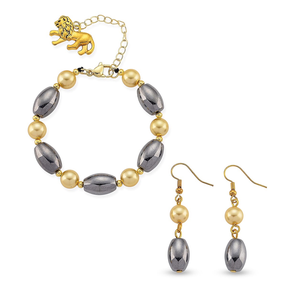 Terahertz 30.00 ctw and Golden Shell Pearl Beaded Bracelet with Lion Charm (6.5-8.5In) and Earrings in Goldtone and Stainless Steel