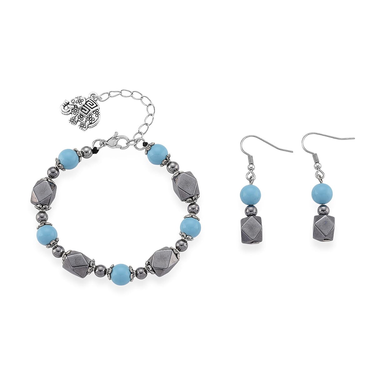 Terahertz 42.00 ctw and Sleeping Beauty Color Shell Pearl Beaded Bracelet with Charm (6.5-8.5In) and Earrings in Silvertone and Stainless Steel