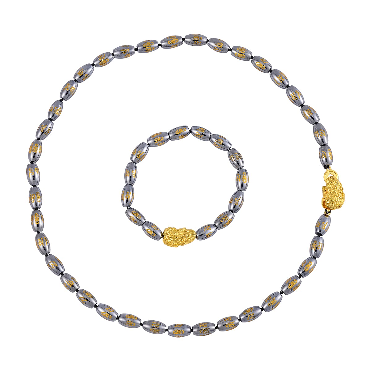 Terahertz Feng Shui Beaded Necklace 20 Inches and Stretch Bracelet with Charm in Goldtone 221.00 ctw