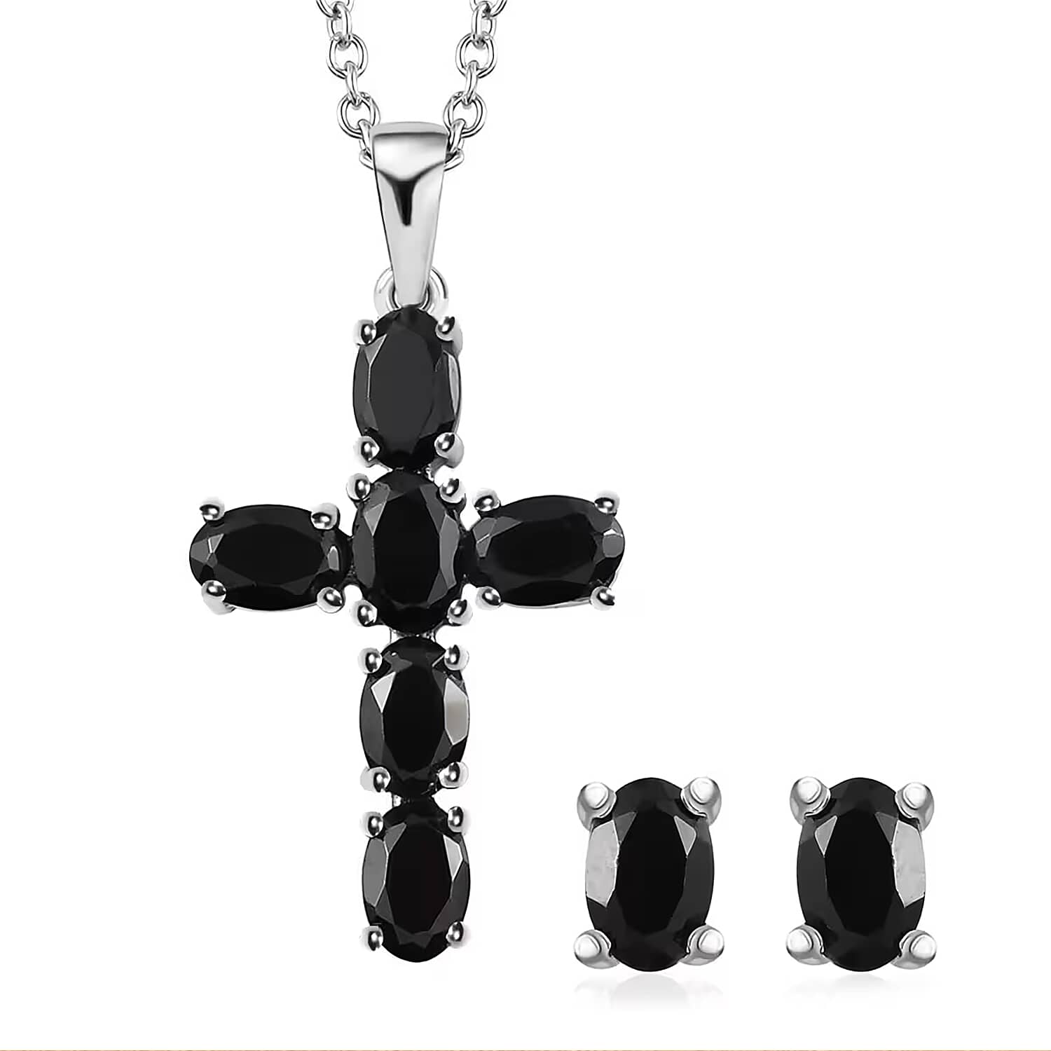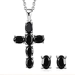 Thai Black Spinel 2.40 ctw Stud Earrings and Cross Pendant Necklace 20 Inches in Stainless Steel