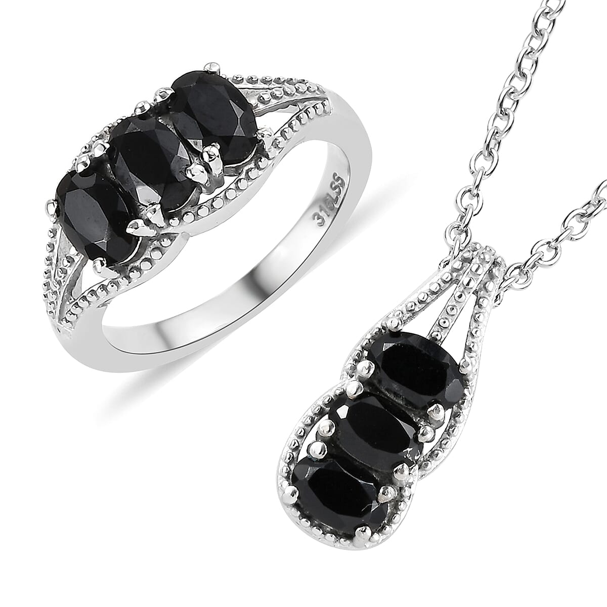 Thai Black Spinel 2.75 ctw 3 Stone Ring Size 5 and Pendant Necklace 20 Inches in Stainless Steel