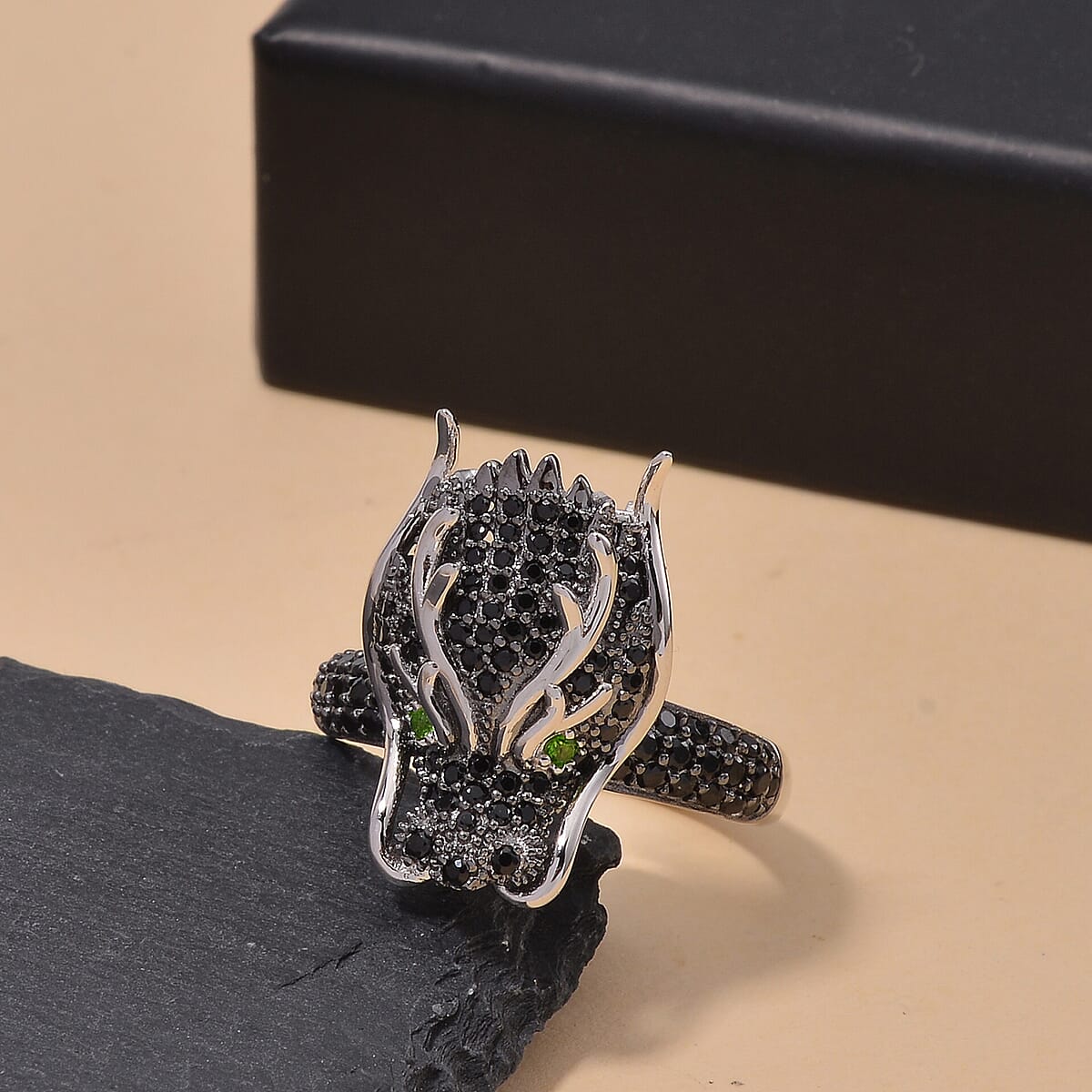 Thai Black Spinel and Chrome Diopside 1.20 ctw Dragon Head Ring in Rhodium Over Sterling Silver (Size 5.0)