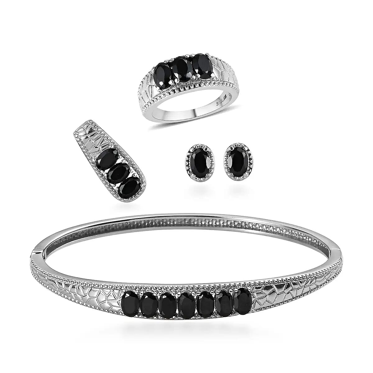 Thai Black Spinel Jewelry Set of Bangle Bracelet, 3 Stone Ring, Pendant and Stud Earrings, Stainless Steel Jewelry Set, Gifts For Her 9.00 ctw