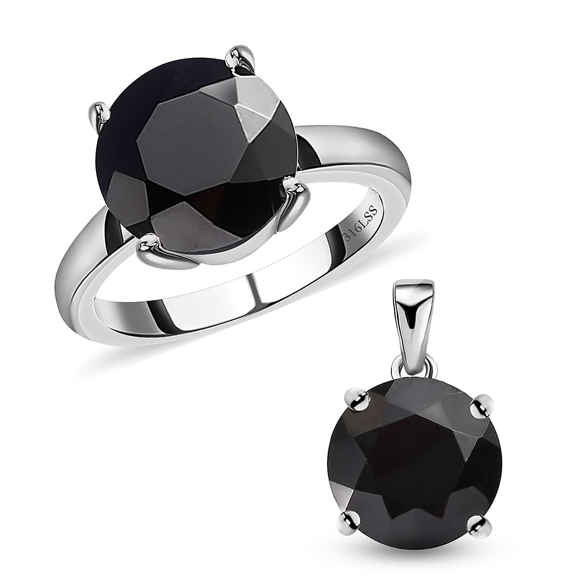 Thai Black Spinel Solitaire Ring (Size 7.0) and Pendant in Stainless Steel 9.10 ctw | Tarnish-Free, Waterproof, Sweat Proof Jewelry