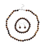 Tiger's Eye 281.50 ctw Beaded Stretch Bracelet, Earrings and Necklace Set in Sterling Silver (18.00 In)