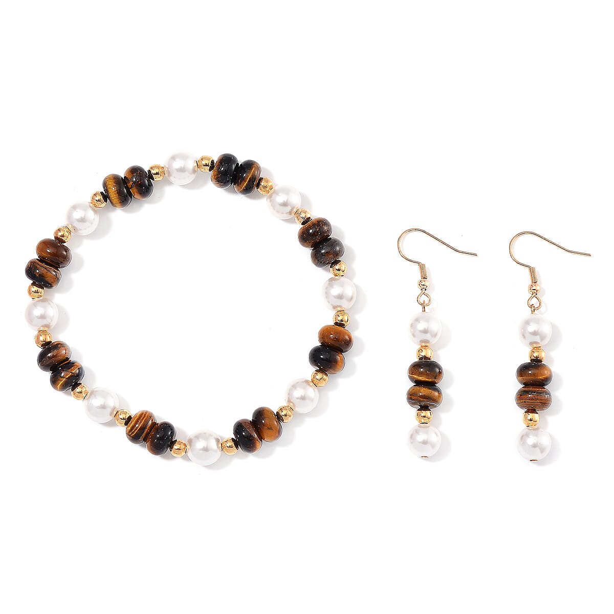 Tigers Eye 50.00 ctw and White Shell Pearl Bracelet (6.50-7.0In) and Earrings in Goldtone