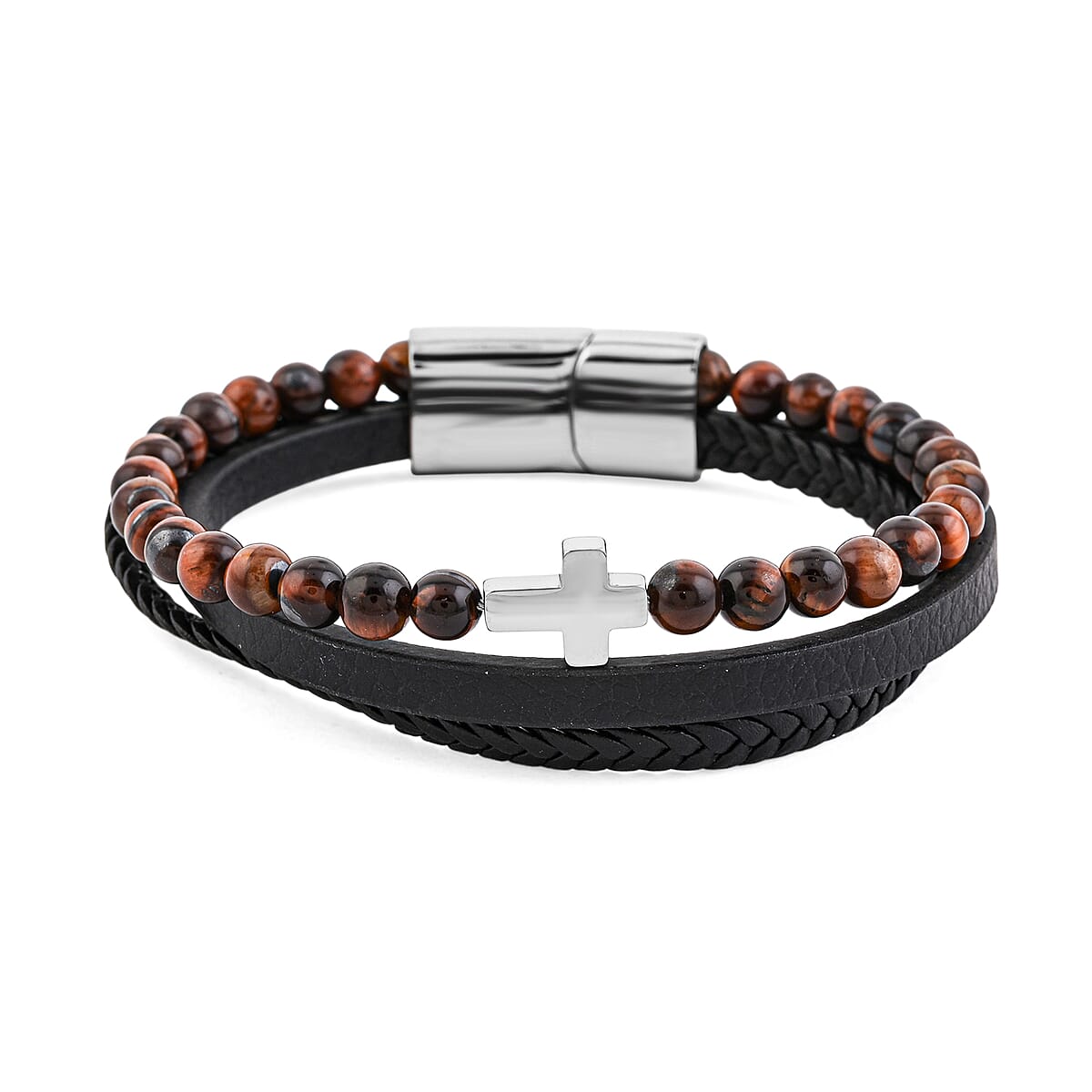 Tigers Eye 55.80 ctw Black Leather Cord Bracelet in Stainless Steel (8.50 In)