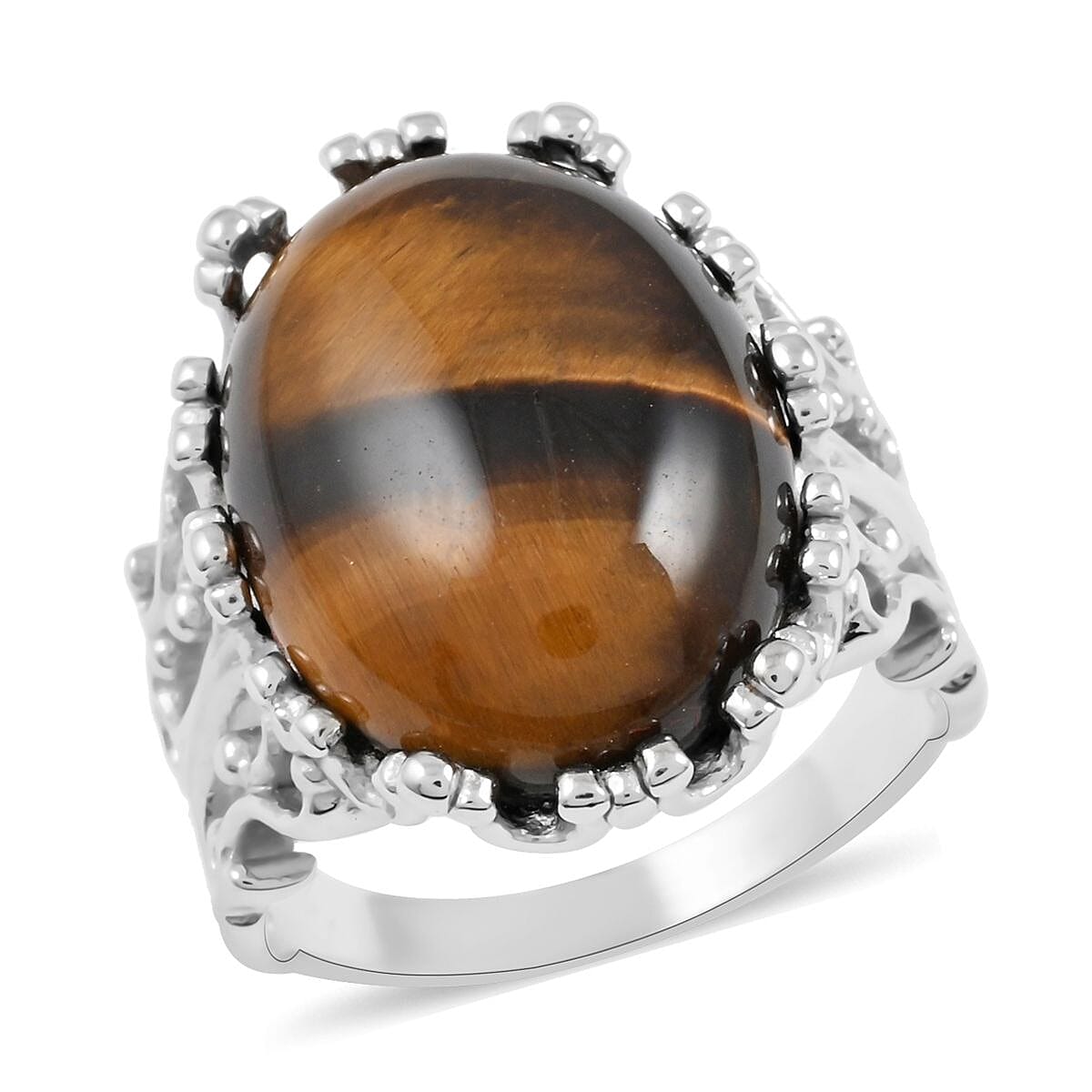 Tigers Eye Solitaire Ring in Rhodium Over Sterling Silver (Size 10) 15.00 ctw