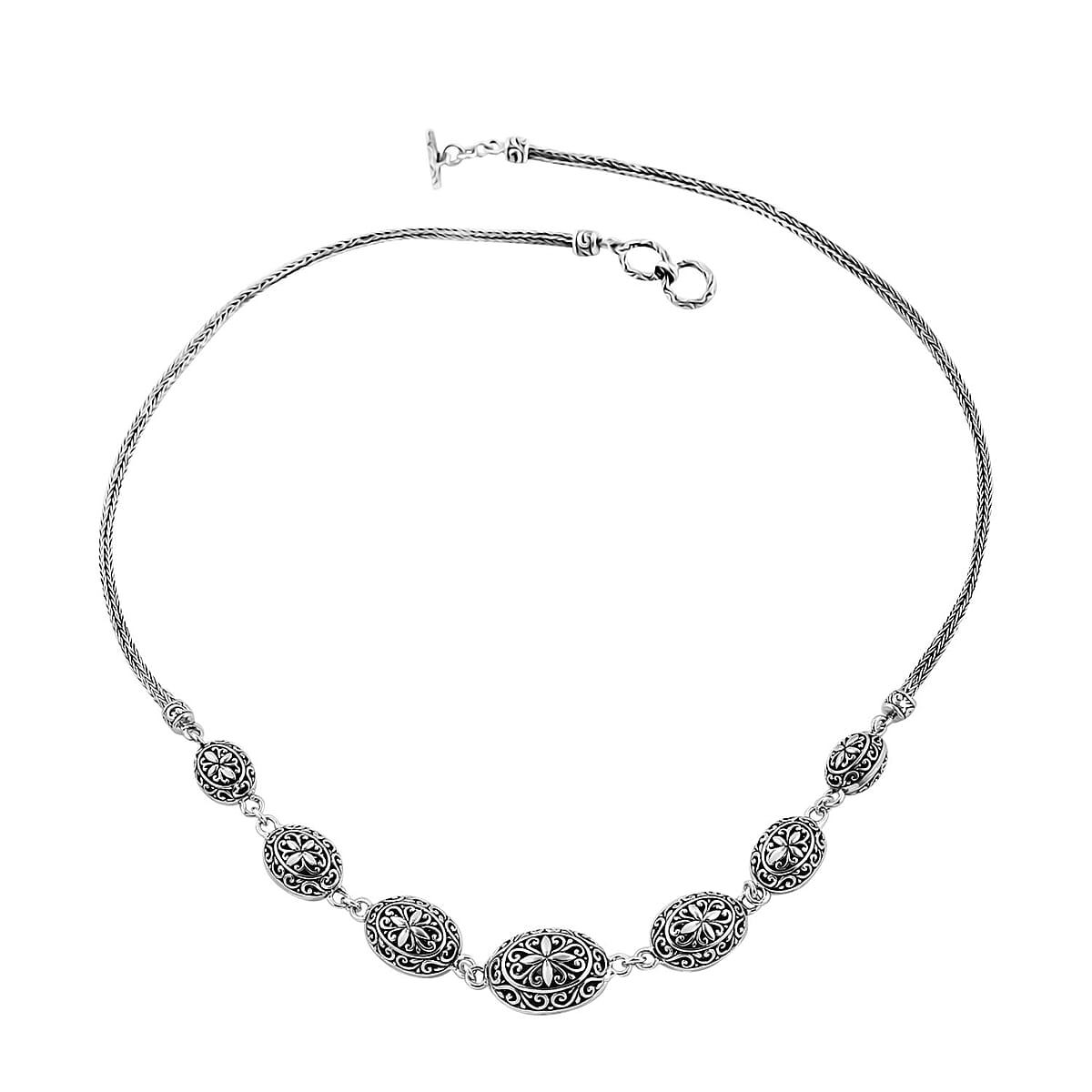 This Bali Legacy floral toggle clasp necklace, masterfully handcrafted in sterling silver, embodies the elegance of Balinese craftsmanship with its refined artistic design. Featuring a secure toggle clasp, this silver necklace combines functionality with beauty, making it an ideal accessory for any ensemble.
