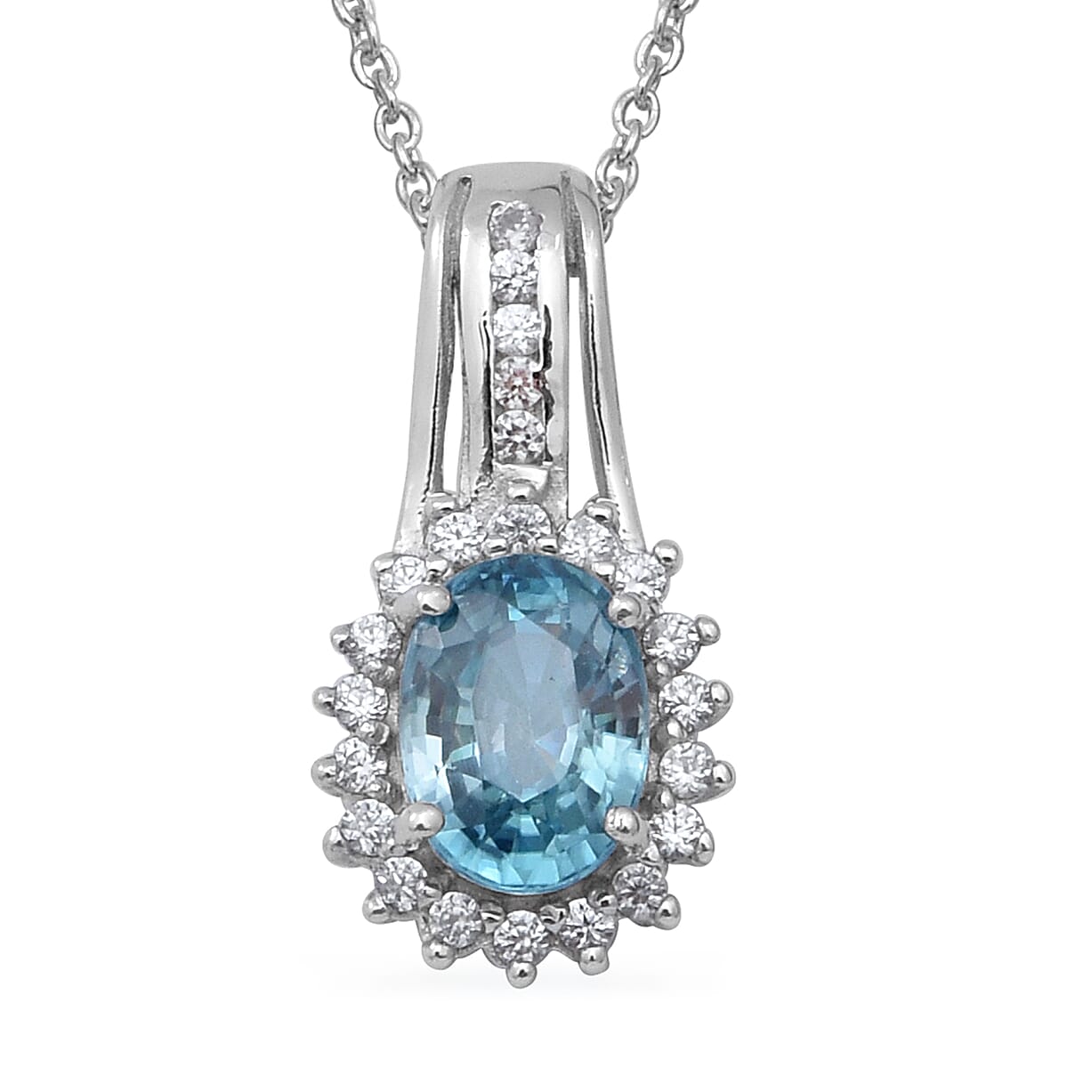 TLV Cambodian Blue Zircon, Natural White Zircon Cocktail Pendant Necklace (18 Inches) in Platinum Over Sterling Silver 2.25 ctw