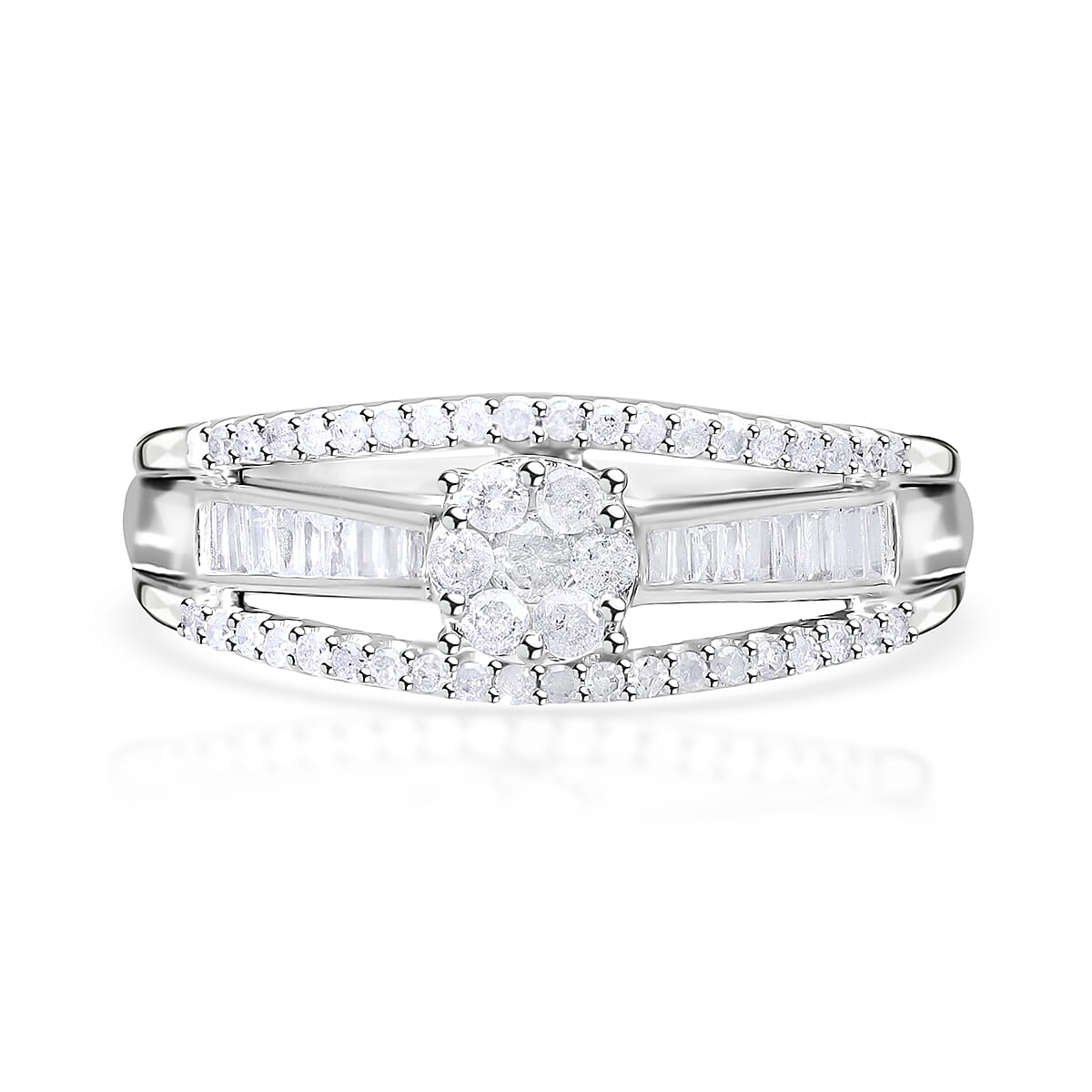 This exquisite diamond ring features a cluster of diamonds at its center, elegantly accentuated with round and baguette diamonds studded split band. The platinum over sterling silver setting enhances the brilliance of the stones, creating a timeless piece of jewelry that radiates sophistication and charm.