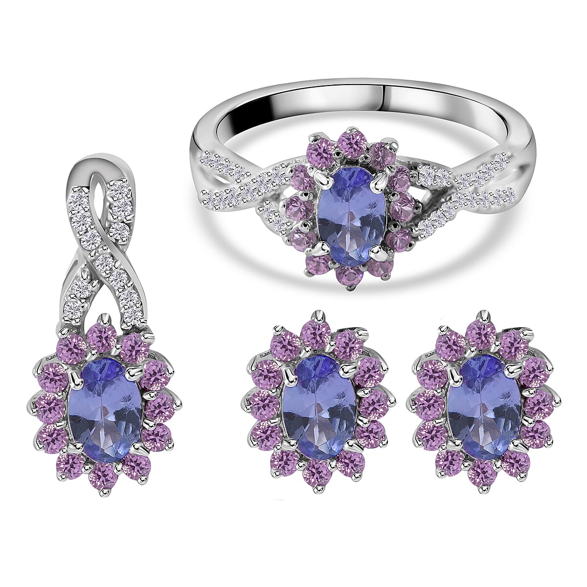 TLV Tanzanite (Ovl), Madagascar Pink Sapphire and White Zircon Floral Stud Earrings, Ring (Size 8) and Pendant in Platinum Over Sterling Silver 3.00 ctw